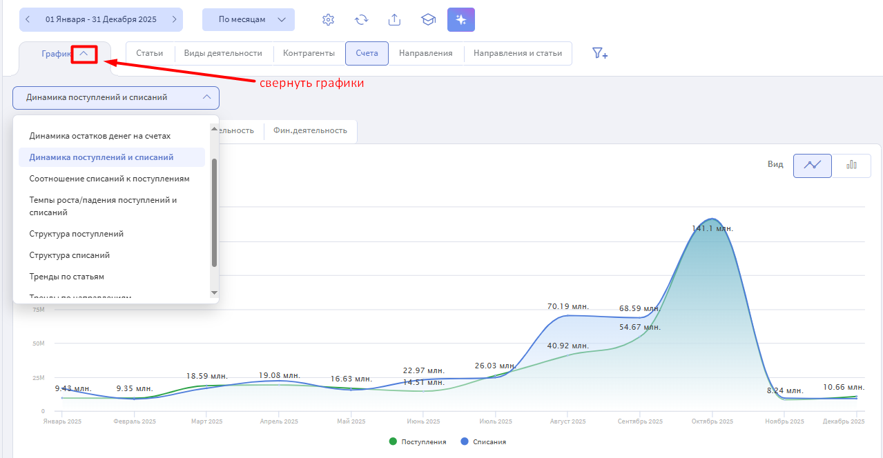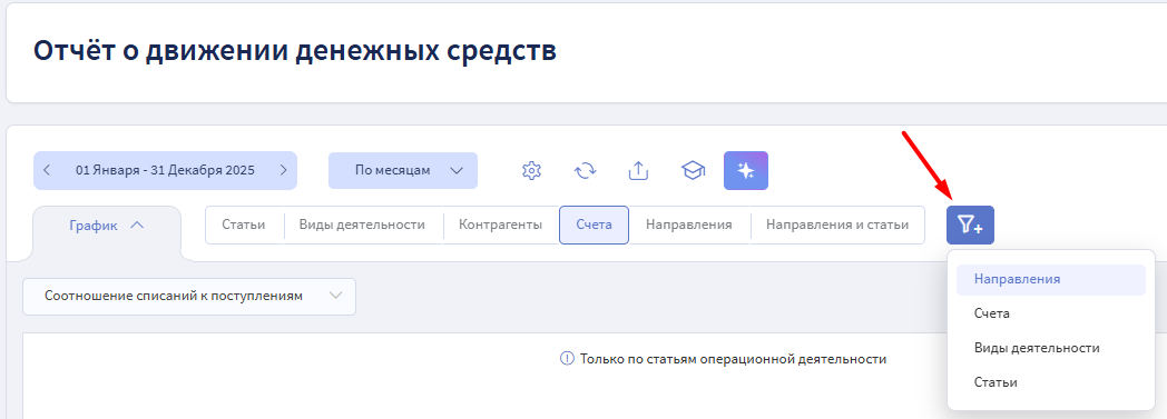 Фильтры по Направлениям, Статьям, Счетам, Видам деятельности — позволяют убрать лишнее и сфокусироваться на главном.
