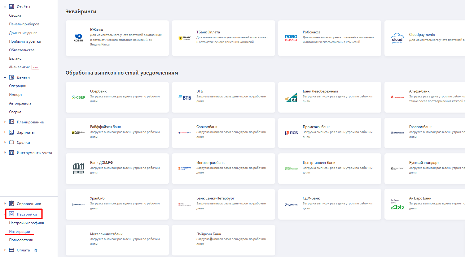 Большинство интеграций, имеющихся в Финтабло, можно найти в разделе "Настройки" — "Интеграции"