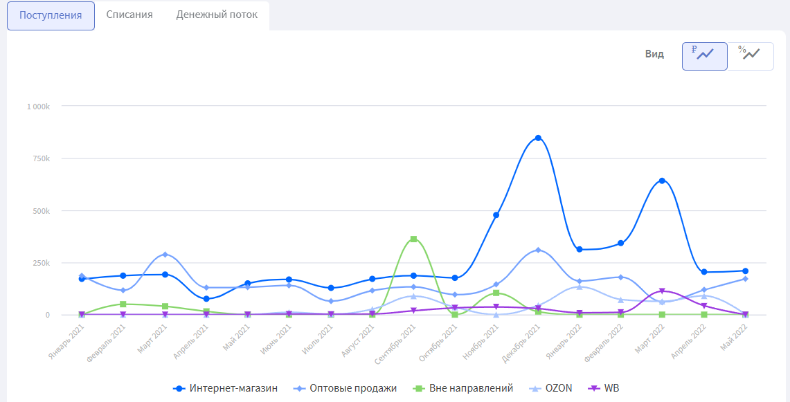 График можно вывести в двух вариациях: в абсолютном значении и в процентах от общего объема.
