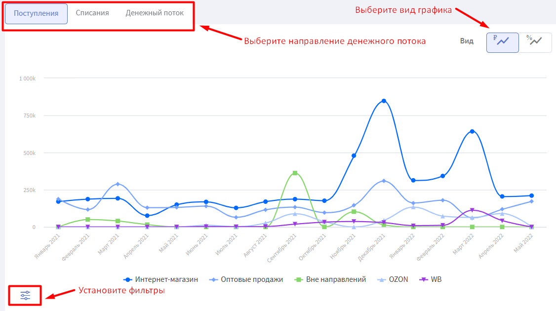 Выберите на графике направление денежного потока (поступления, списания или чистый денежный поток). При необходимости установите фильтры, чтобы сфокусироваться на главном.