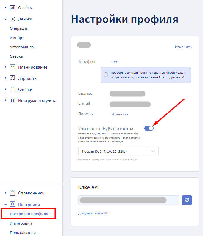 В карточке профиля найдите переключатель Учитывать НДС в отчетах.