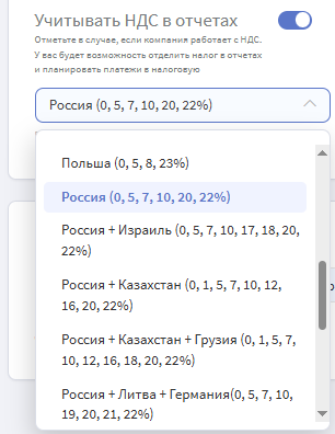 Список процентных ставок налога зависит от того, резидентом какой страны для оплаты налога вы являетесь. Страну можно выбрать изначально при создании компании или изменить в настройках профиля.