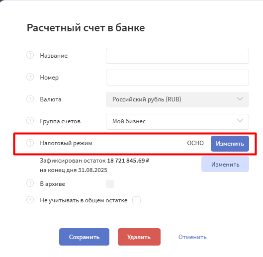 Для каждого счета налоговый режим настраивается индивидуально, так как счета могут принадлежать разным юридическим лицам.