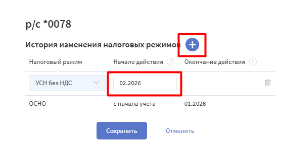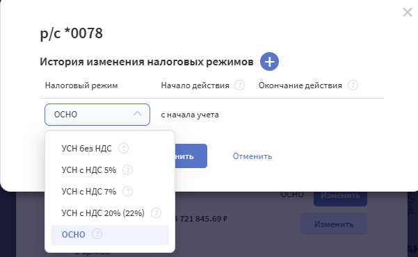 Если налоговый режим в процессе деятельности юрлица меняется, его также можно изменить в карточке счета, указав период, в котором произошли изменения. При этом на прошлый период изменения уже не повлияют.