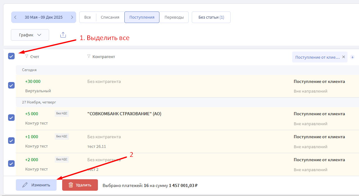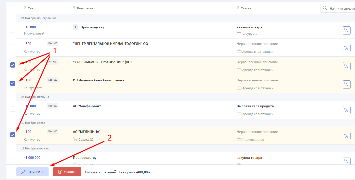 1. В разделе Деньги → Операции выделить галочками несколько операций в списке.