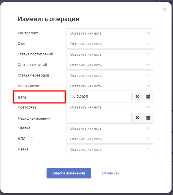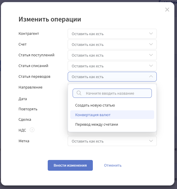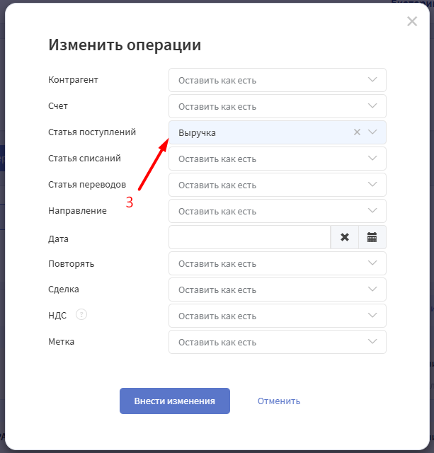 5. Поменяйте статью для выбранных операций → "Внести изменения"