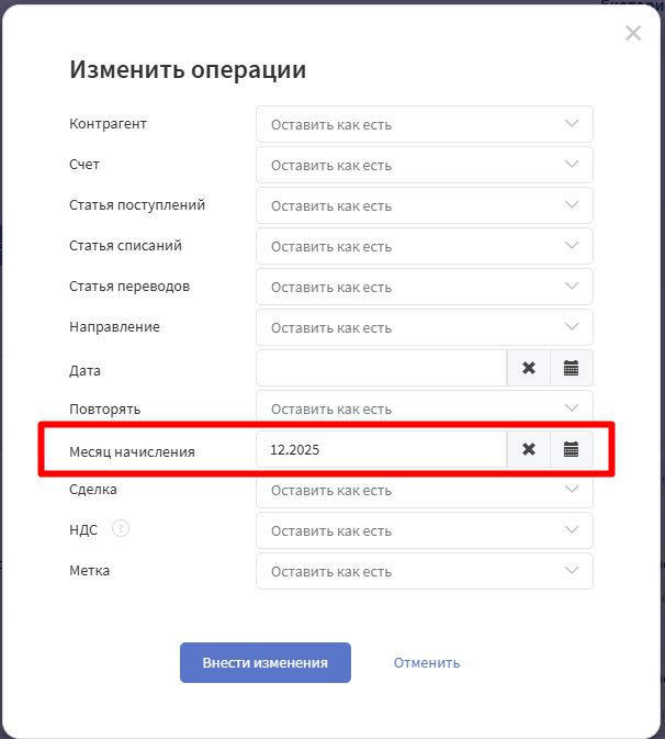 ❗ Месяц начисления можно изменить ТОЛЬКО у операций из статей ДДС, которые подключены к ОПиУ как источник данных.