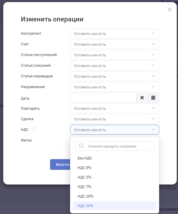 Пример 3. Назначить НДС -> массово поставить ставку НДС к операциям.